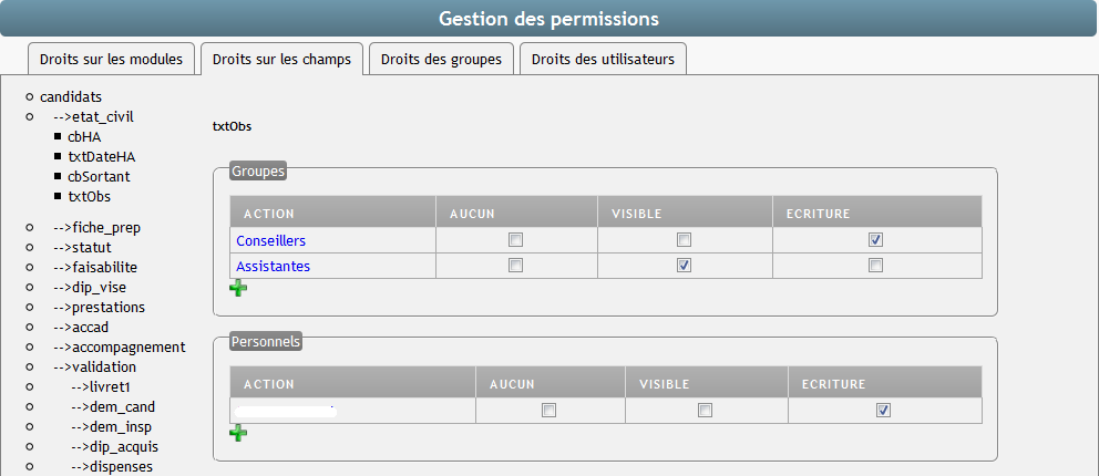 Les permissions sont les droits d’accès aux différents modules de IVAE. La gestion des permissions peut aller jusqu’au paramétrage des droits sur les champs d’un module.